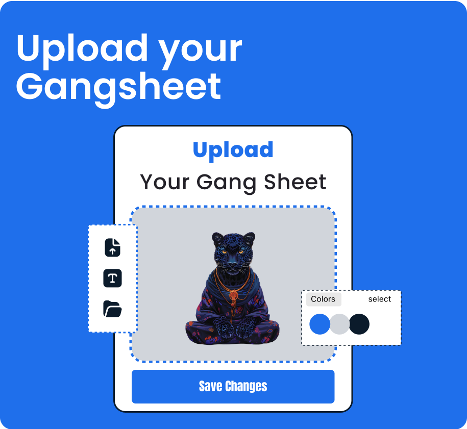 Choose your size and place multiple designs on one sheet with our DTF gang sheet tool. Auto spacing, press-ready, next day shipping.