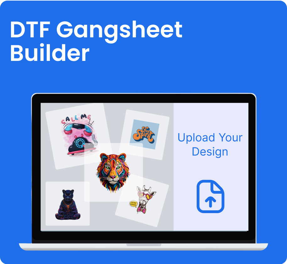 Choose your size and place multiple designs on one sheet with our DTF gang sheet tool. Auto spacing, press-ready, next day shipping.